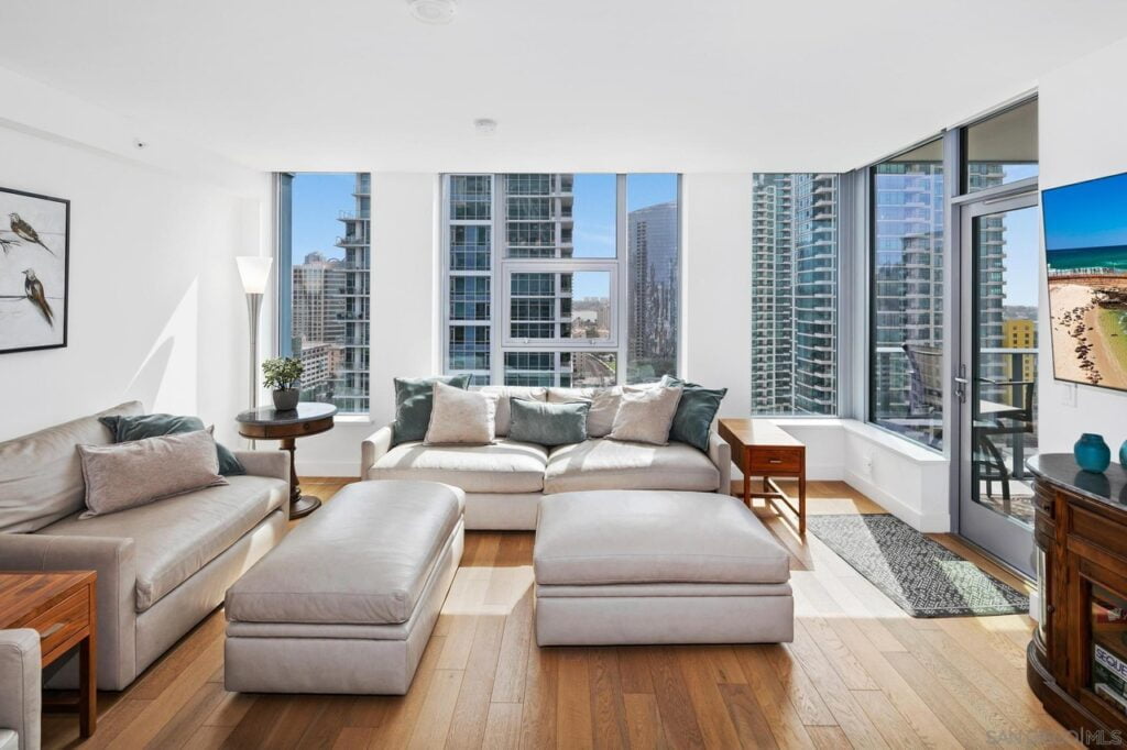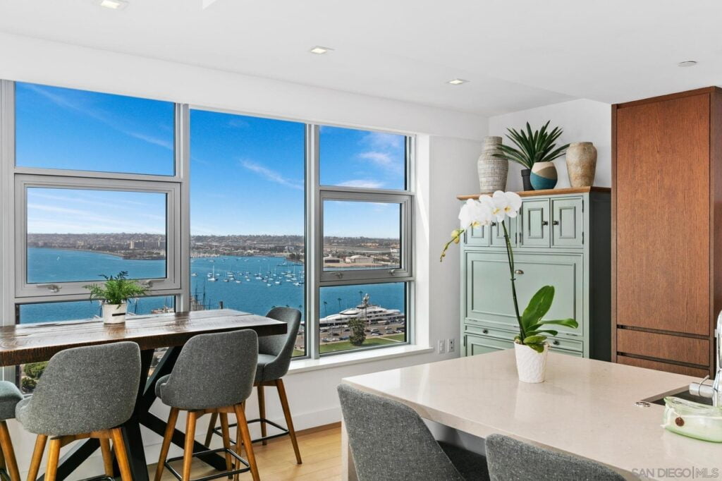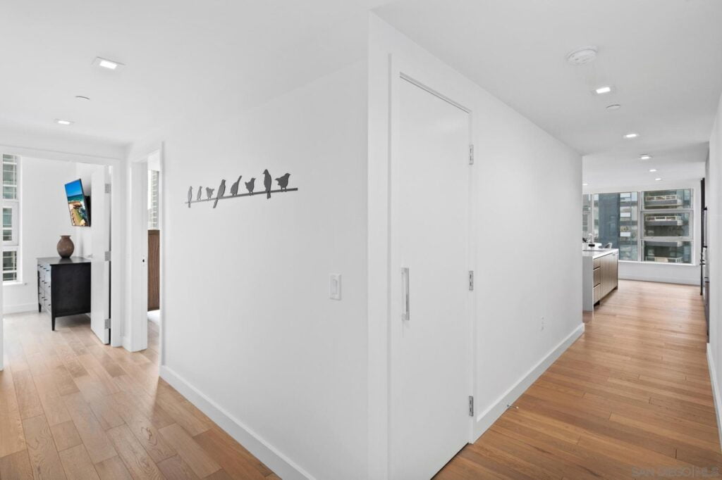 Welcome to Savina! One of San Diego’s newest luxury high-rise towers; to the rarely available South West corner unit. This two bedroom and two bath unit offers dramatic views from every window of the bay, ocean or city lights. Watch planes taking off and landing from your balcony. With an open floor plan boasting a kitchen with a large island and high end cabinetry and appliances. Motorized window shades in all rooms. Ceiling fans with lights in the living room and bedrooms. Hardwood floors throughout living area and bedrooms.