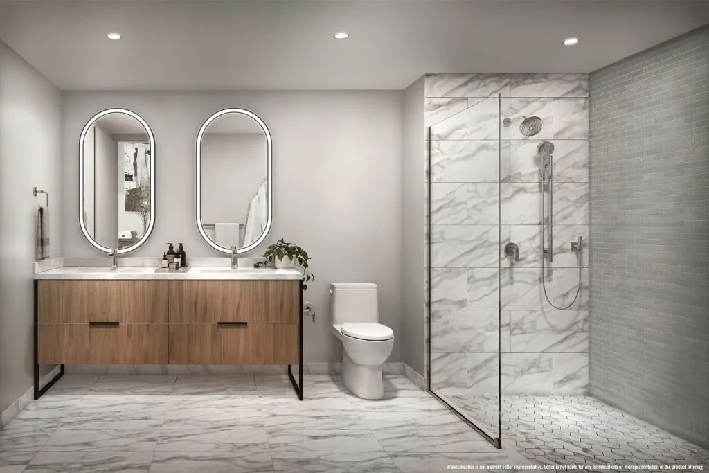 - 2 卧室和 3 卧室住宅中的弯边玻璃封闭式淋浴房。.